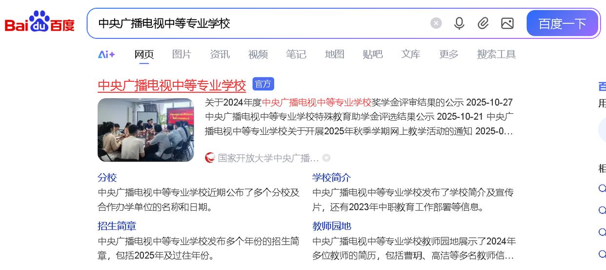1、百度搜索“中央广播电视中等专业学校”,点击带有“官方”认证标识的结果进入官网。